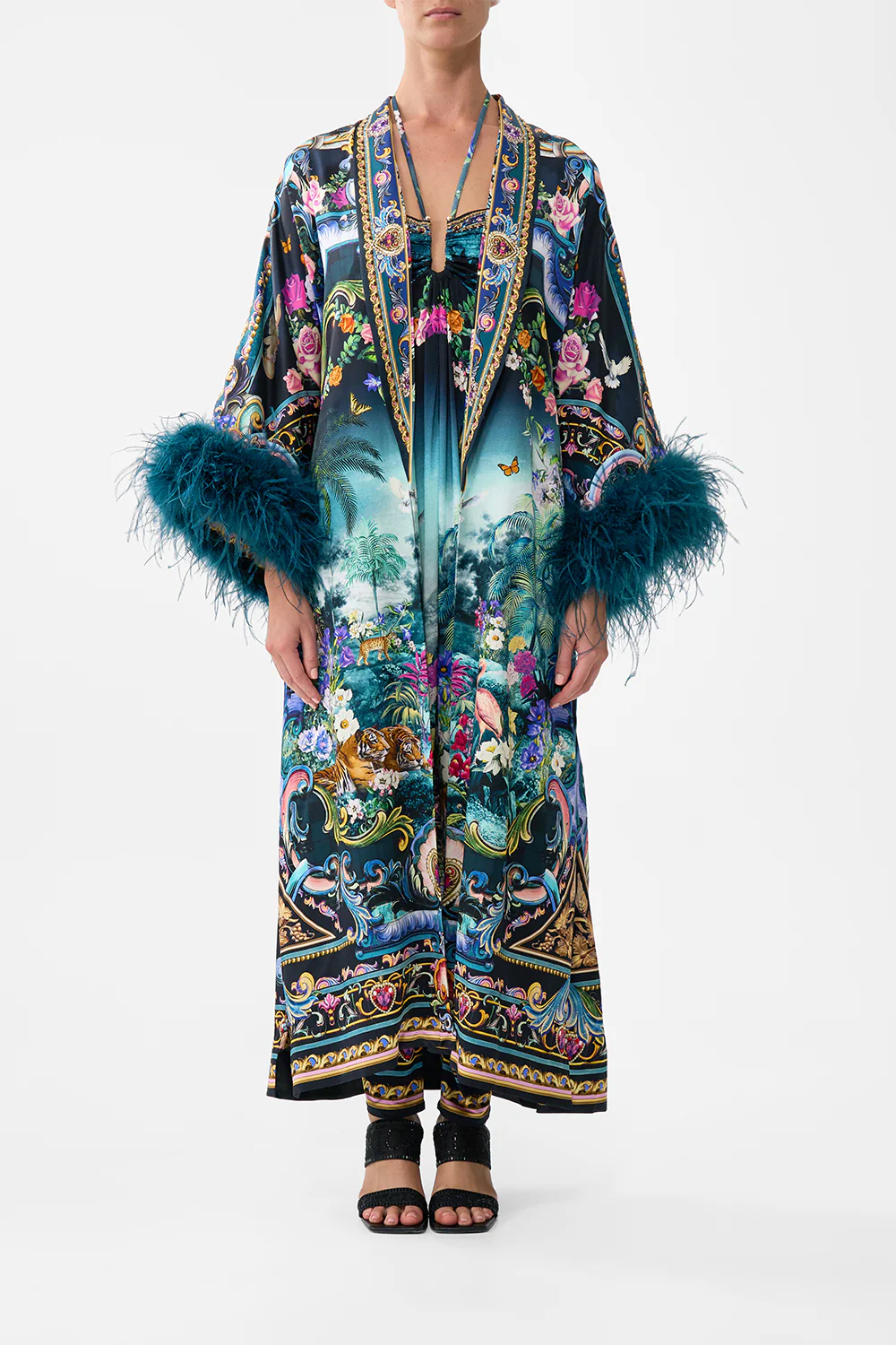 LONG ROBE WITH NARROW COLLAR AND FEATHERS BASKED IN BAROQUE